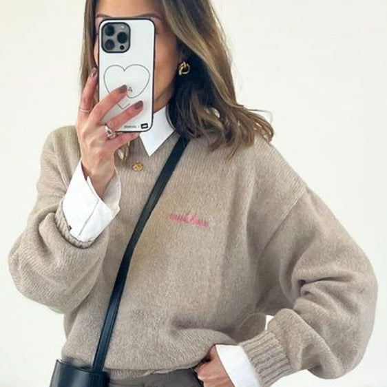 This season, the Buzelin jumper has been reinvented with an exclusive touch from Maison Labiche: personalization. Your words take shape in braided cashmere cord, hand-crocheted and then embroidered in France. An original font and the colour of your choice make this a unique and personal piece.