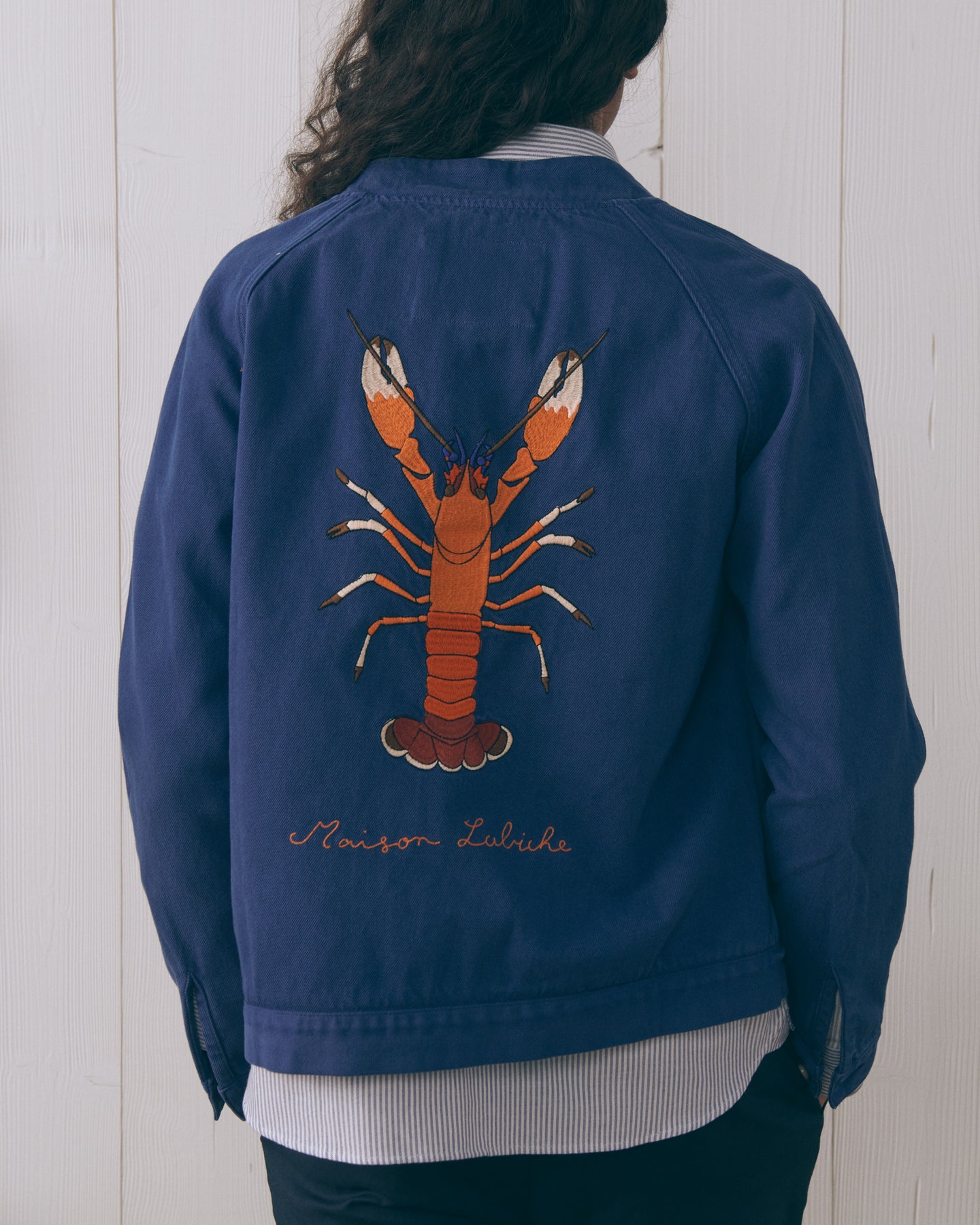Our essential Amelot jacket has a straight cut, a teddy collar, piped side pockets, and buttoned cuffs and hem. Its embroidery is for lobster lovers.