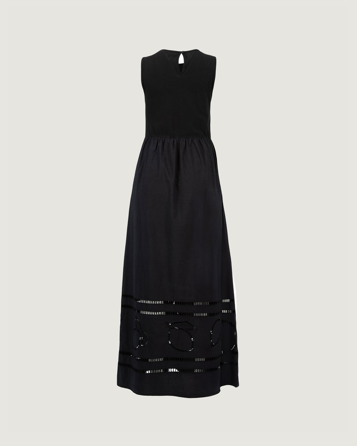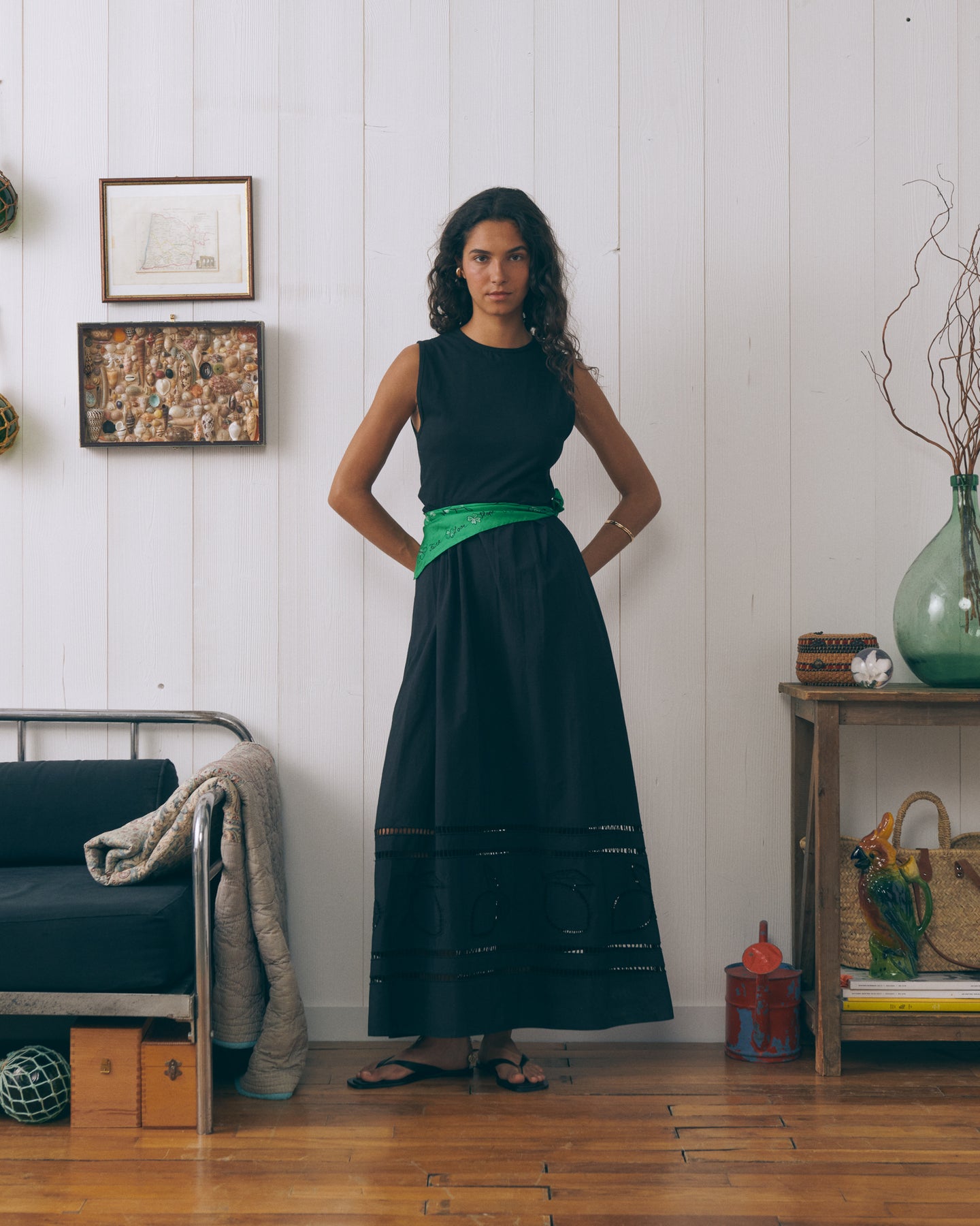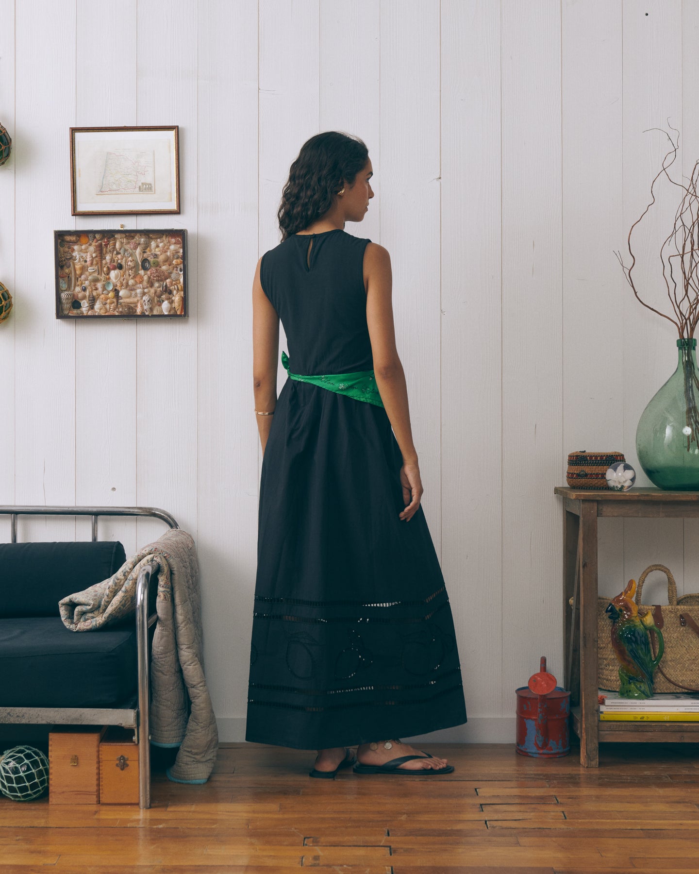 Our Cresson dress is made of two different materials and is sleeveless. Its English embroidery pays homage to the lemon, its zest and its zest.