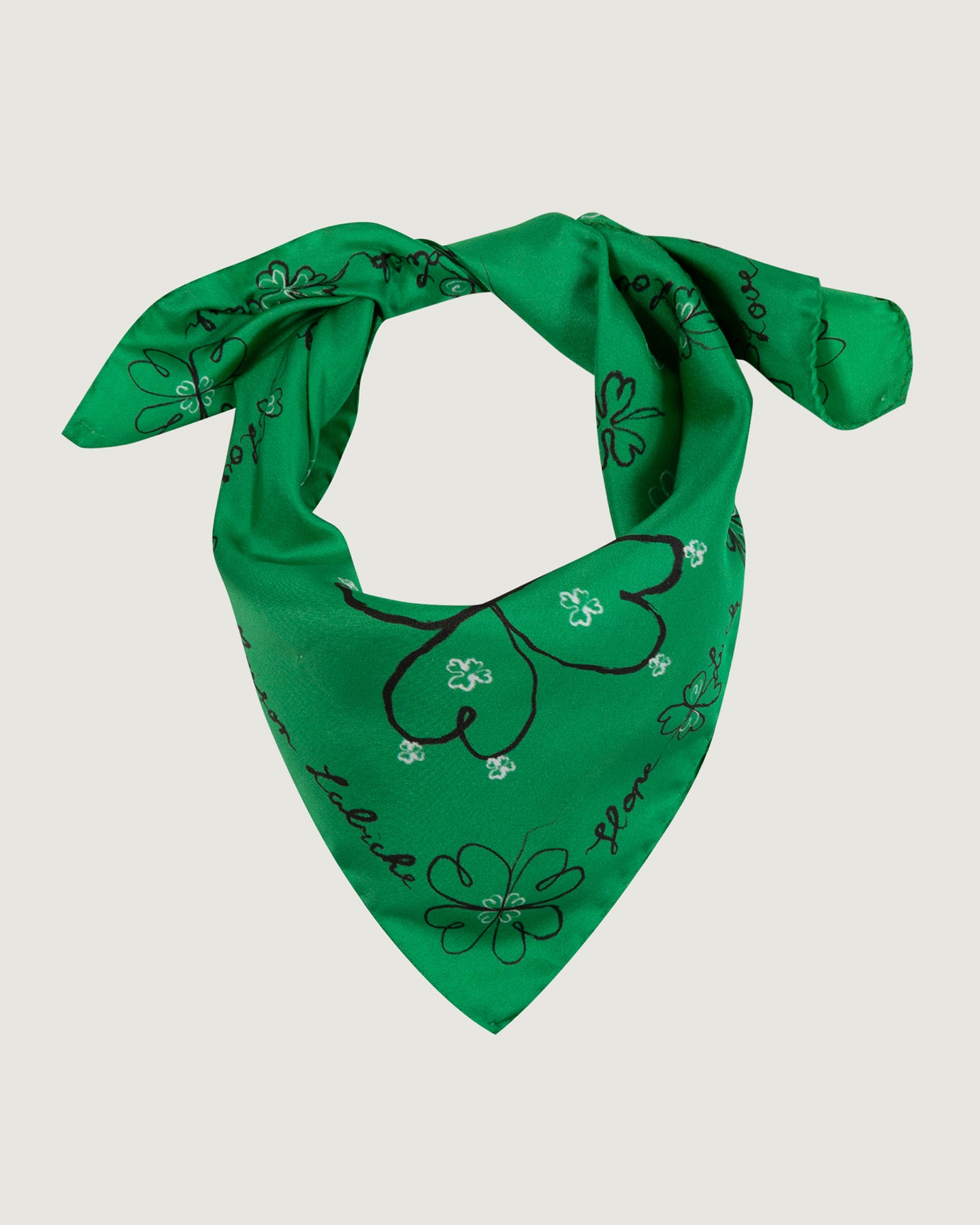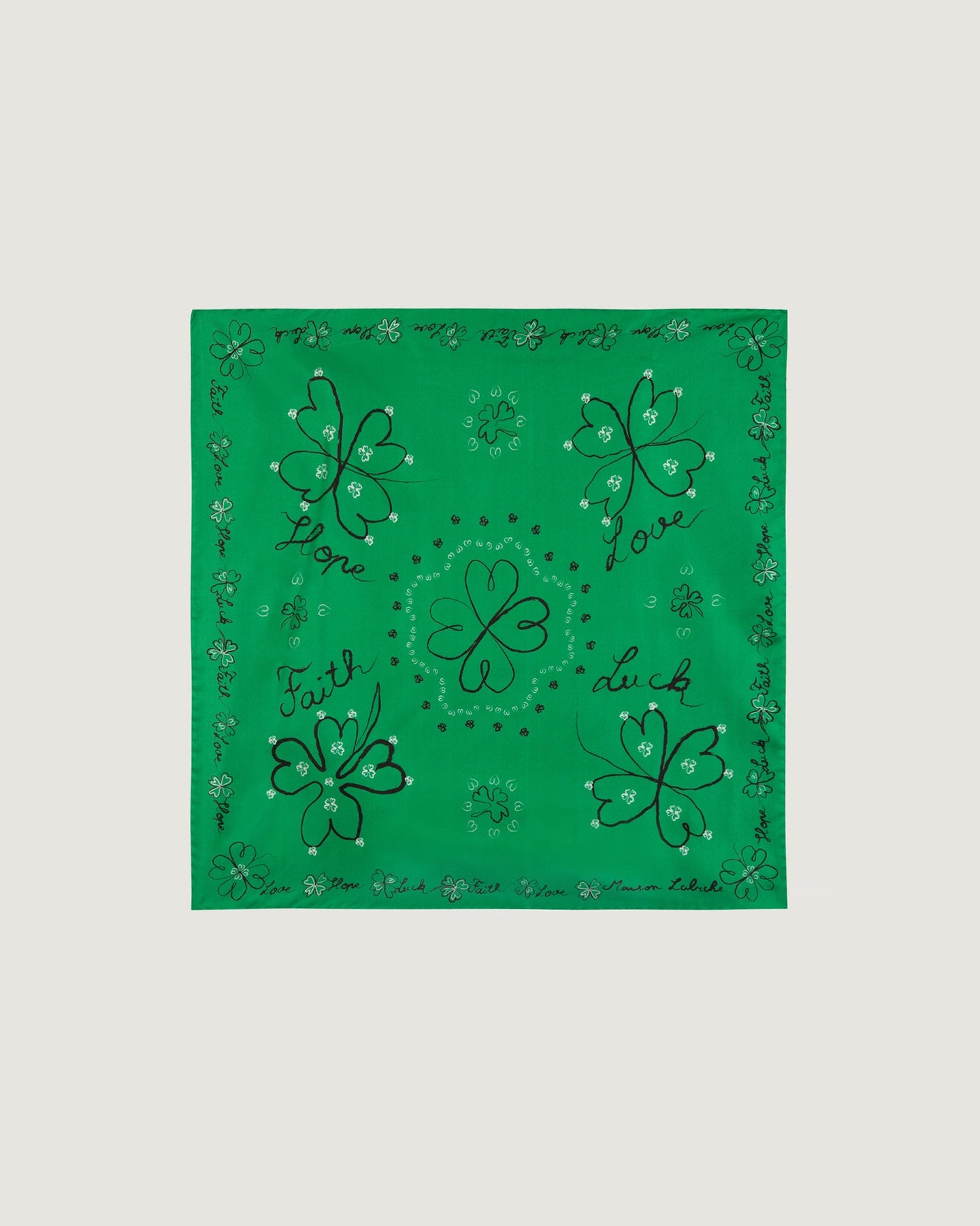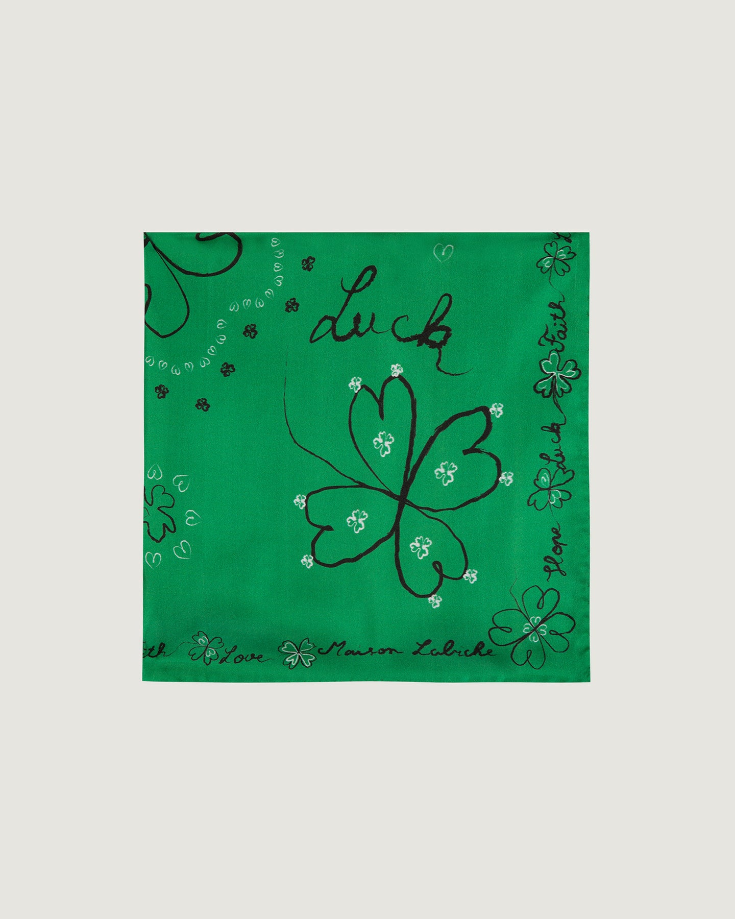 Our Boulinois printed silk scarf is a square measuring 55x55 cm. Its print depicts the symbolism of the clover, which brings love, faith, hope, and luck.