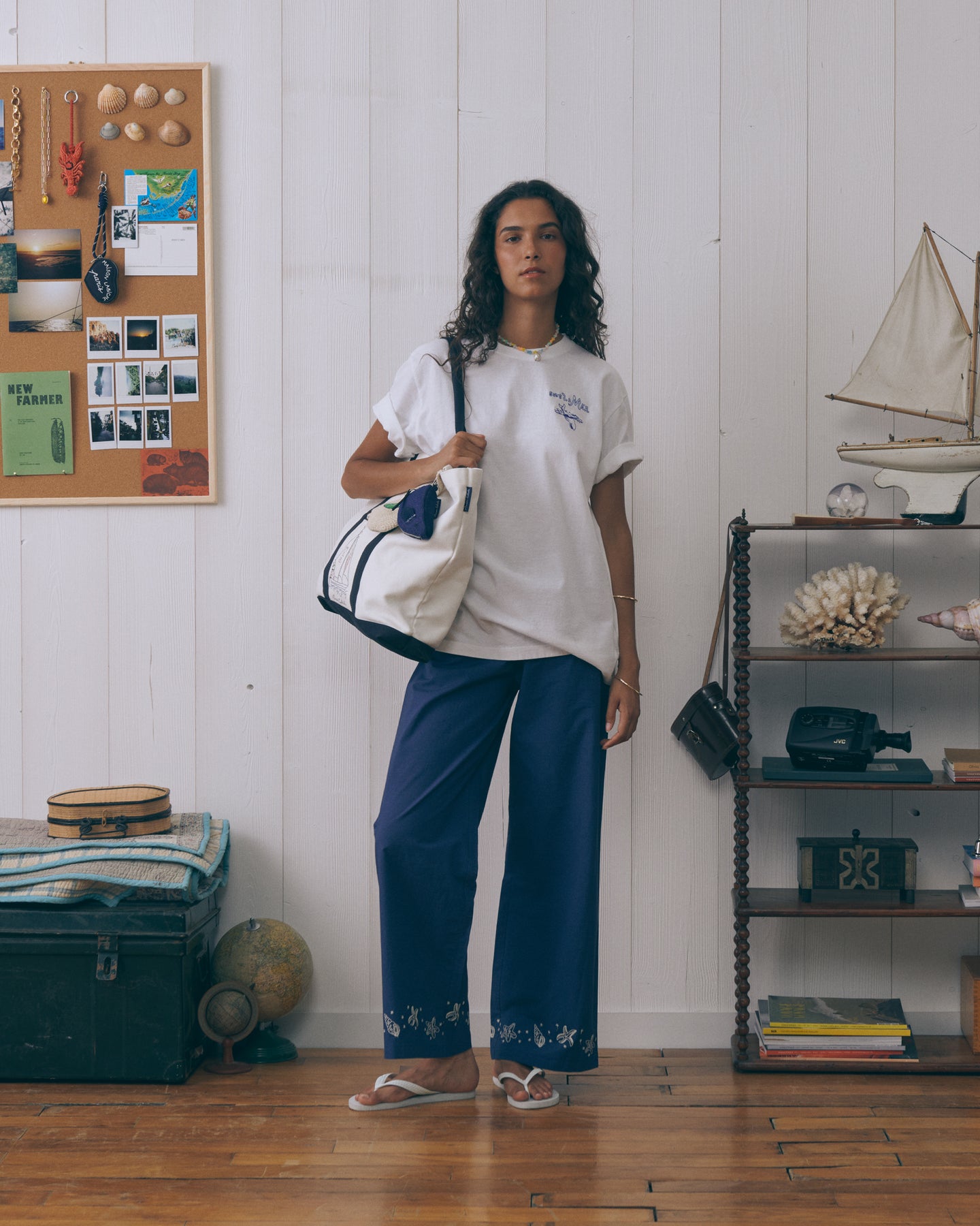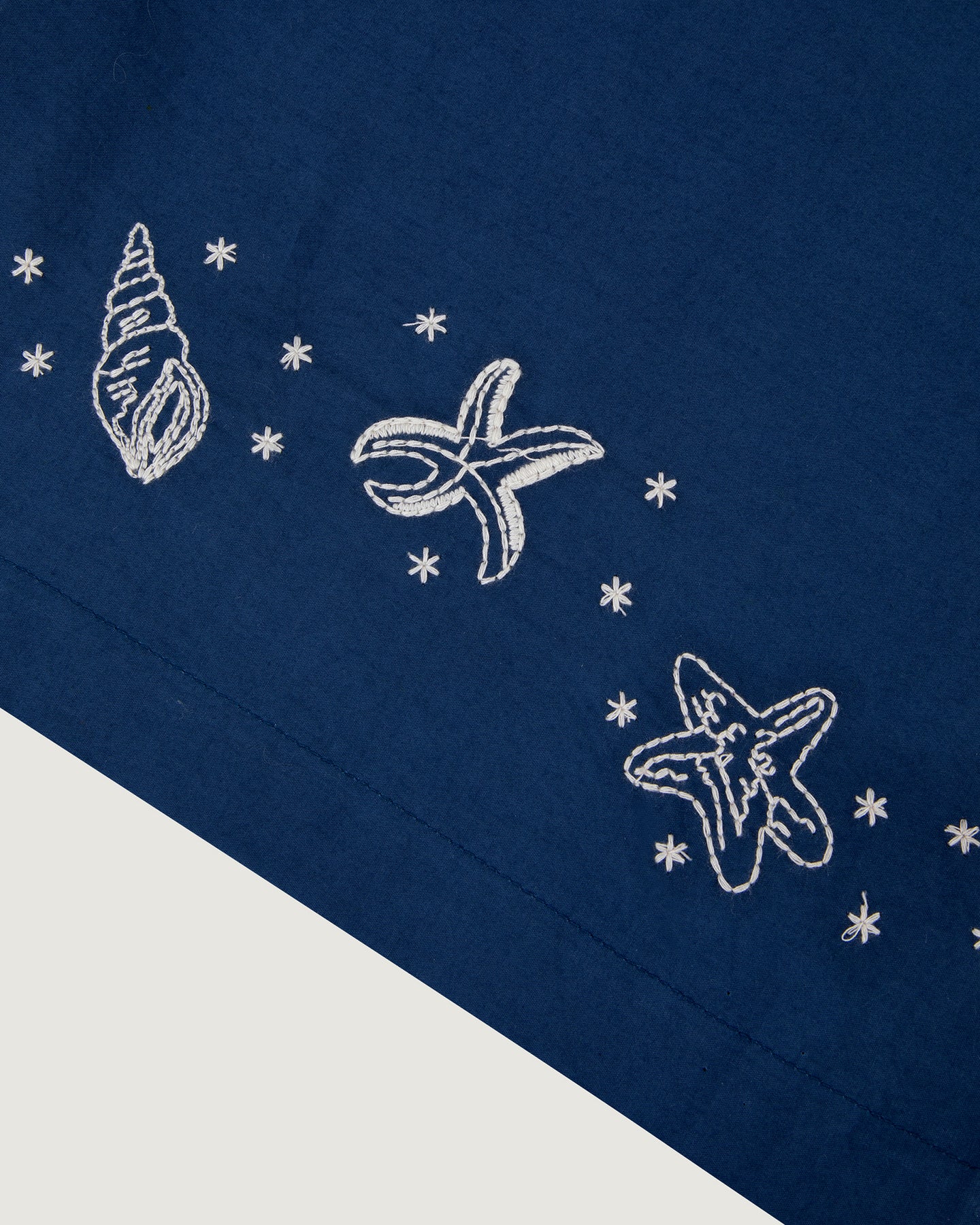 Our Oudin pants are loose and lightweight, featuring patch pockets and an elasticated waistband. Its embroidery is a marine allegory.