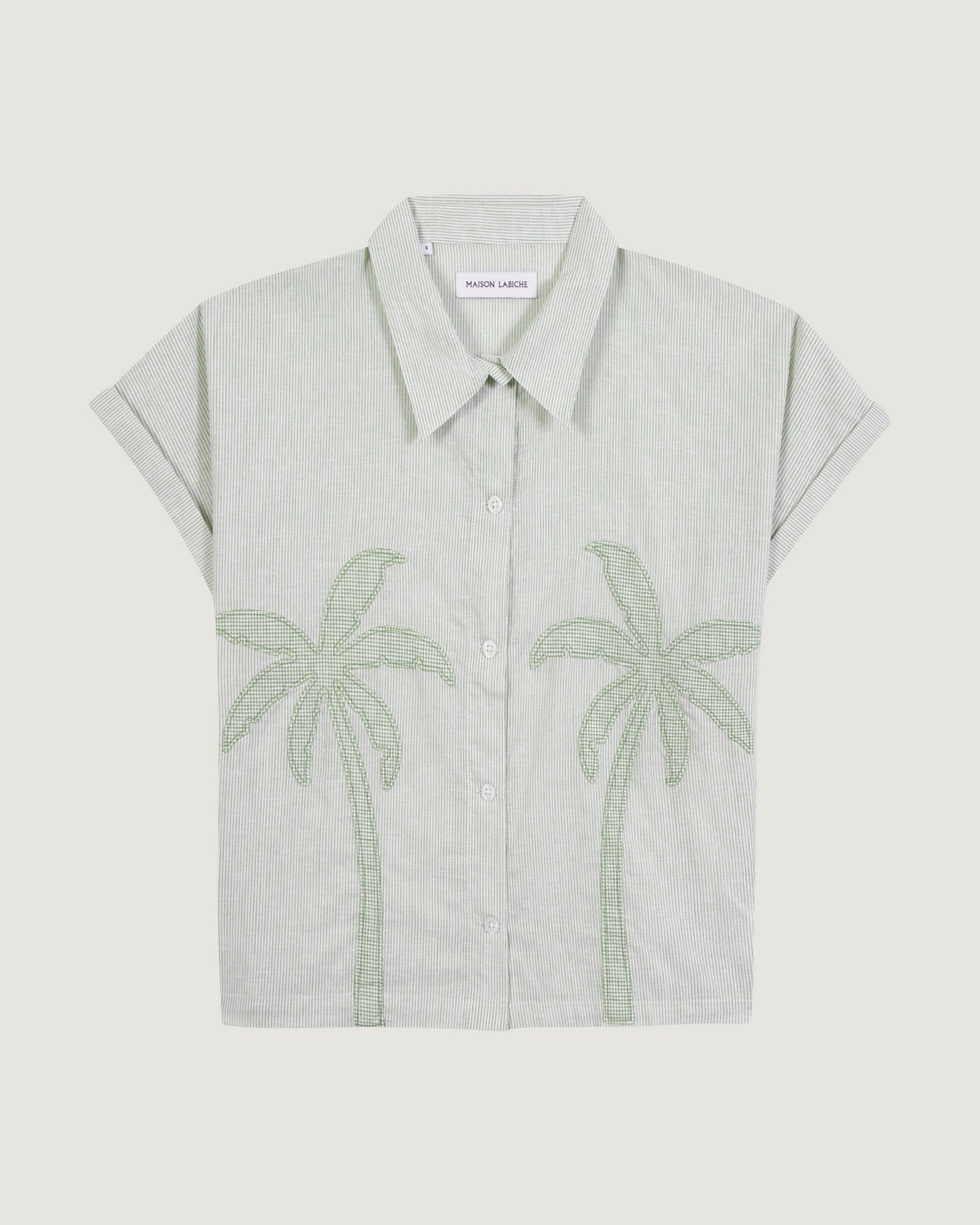 Our Surville short-sleeved shirt features a short, loose and straight cut, a shark collar and Maison Labiche engraved buttons. Its applied embroidery transports you to summer.