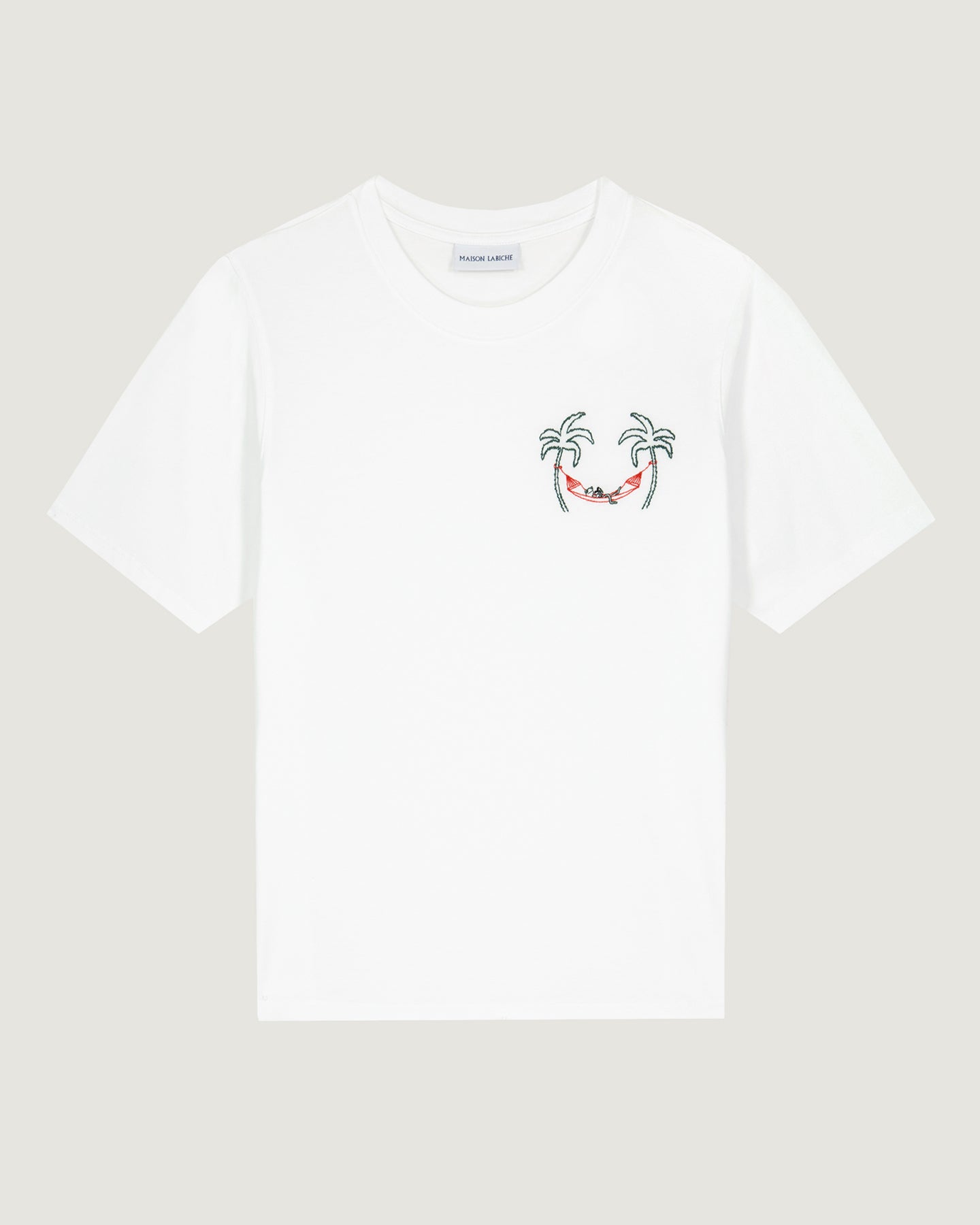 Our iconic Popincourt T-shirt has a straight cut, a ribbed crew neck, an internal neck tape, and double-needle stitching at the hems. her embroidery illustrates a holiday grail