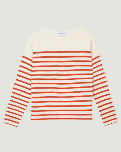 Notre marinière Colombier a une coupe droite, une encolure ronde et ouverte ainsi qu’une finition manches et bas de corps en double aiguilles.
