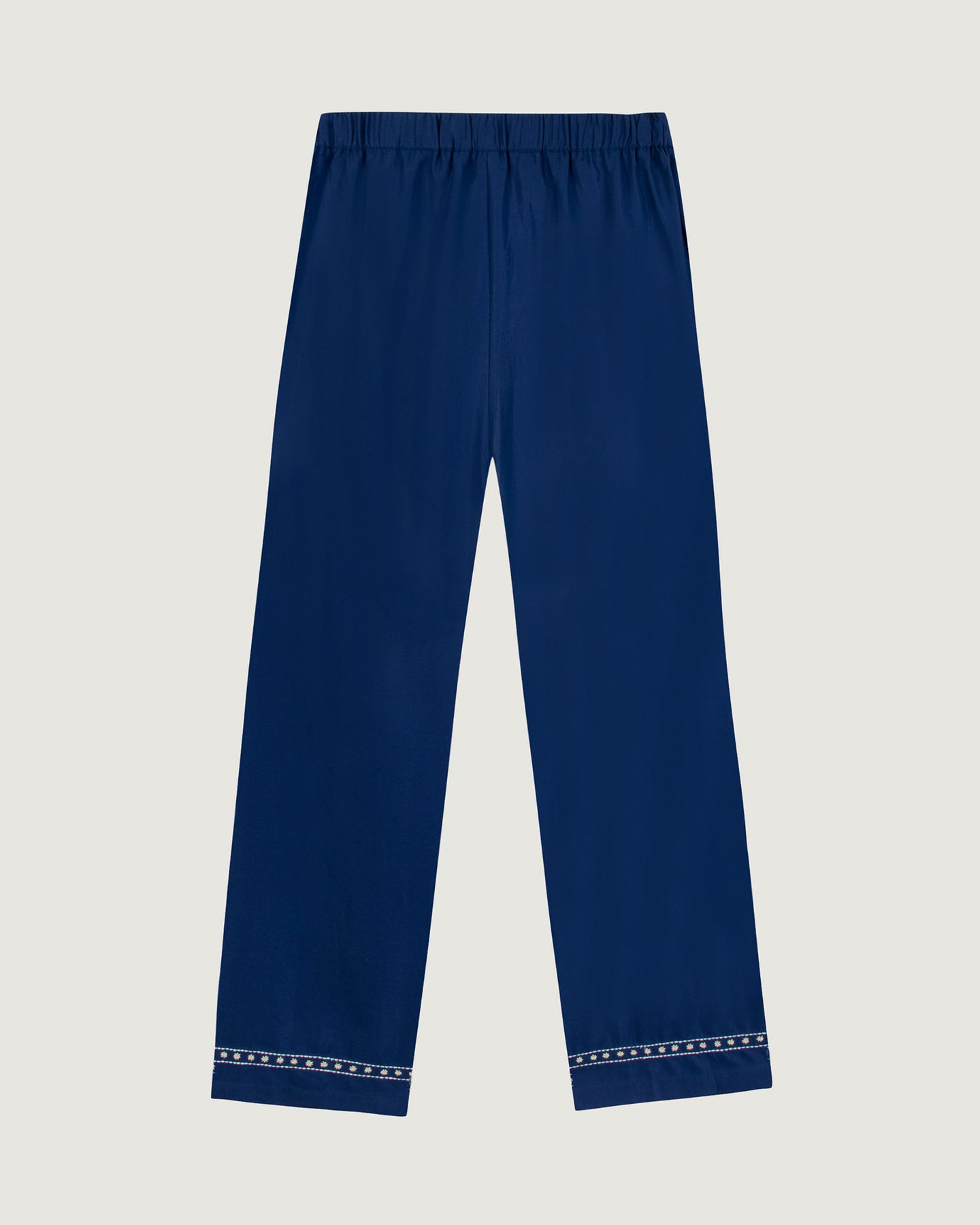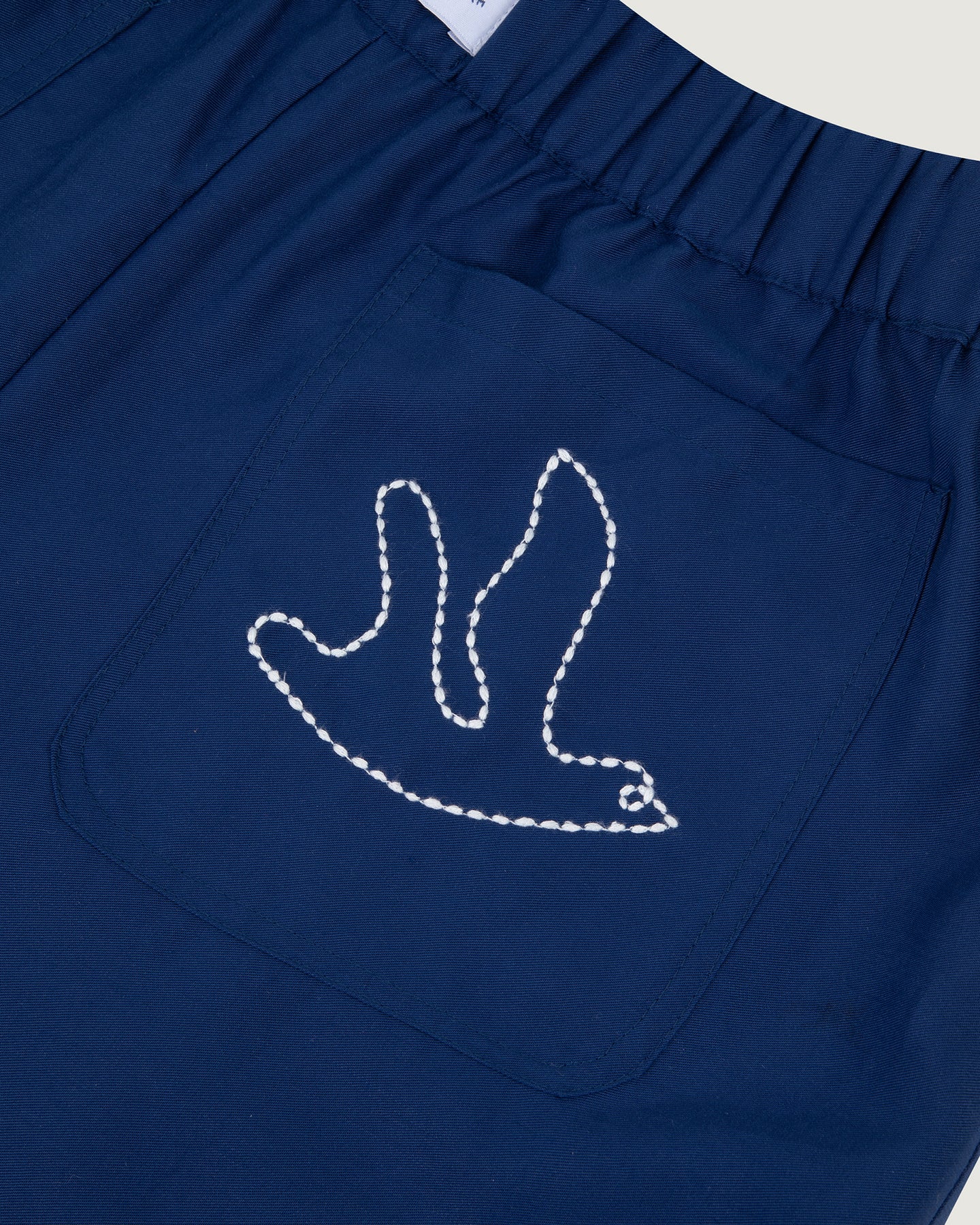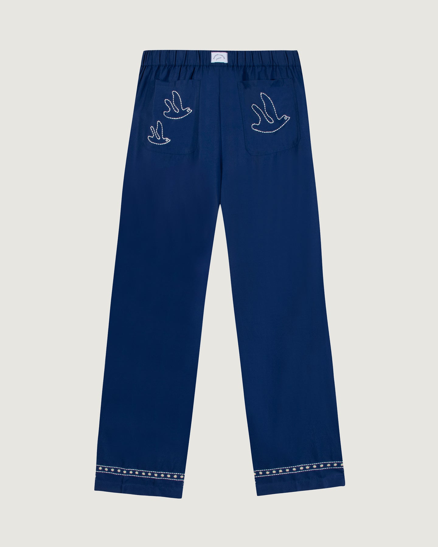 Notre pantalon Oudin est ample et léger, doté de poches plaquées et d'une taille élastiquée. Sa broderie est une ode au ciel.