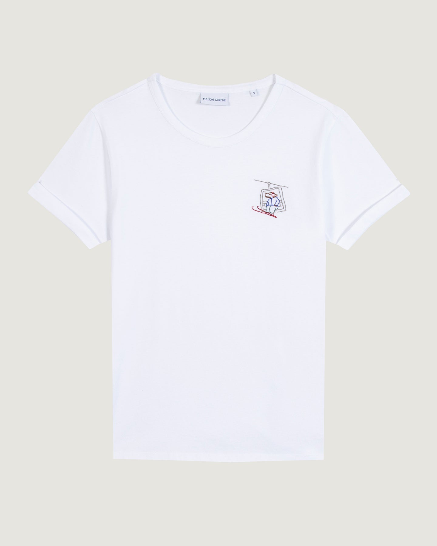 Notre tee-shirt intemporel Poitou pour femme a une coupe ajustée, des revers en bas des manches et une encolure finie avec un colletage en bord-côte. Sa broderie est pour ceux qui se demandent quand ils reverront ce pays merveilleux.