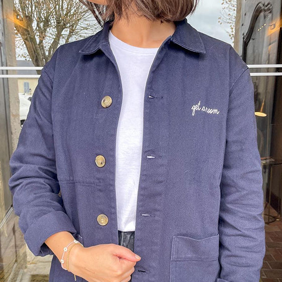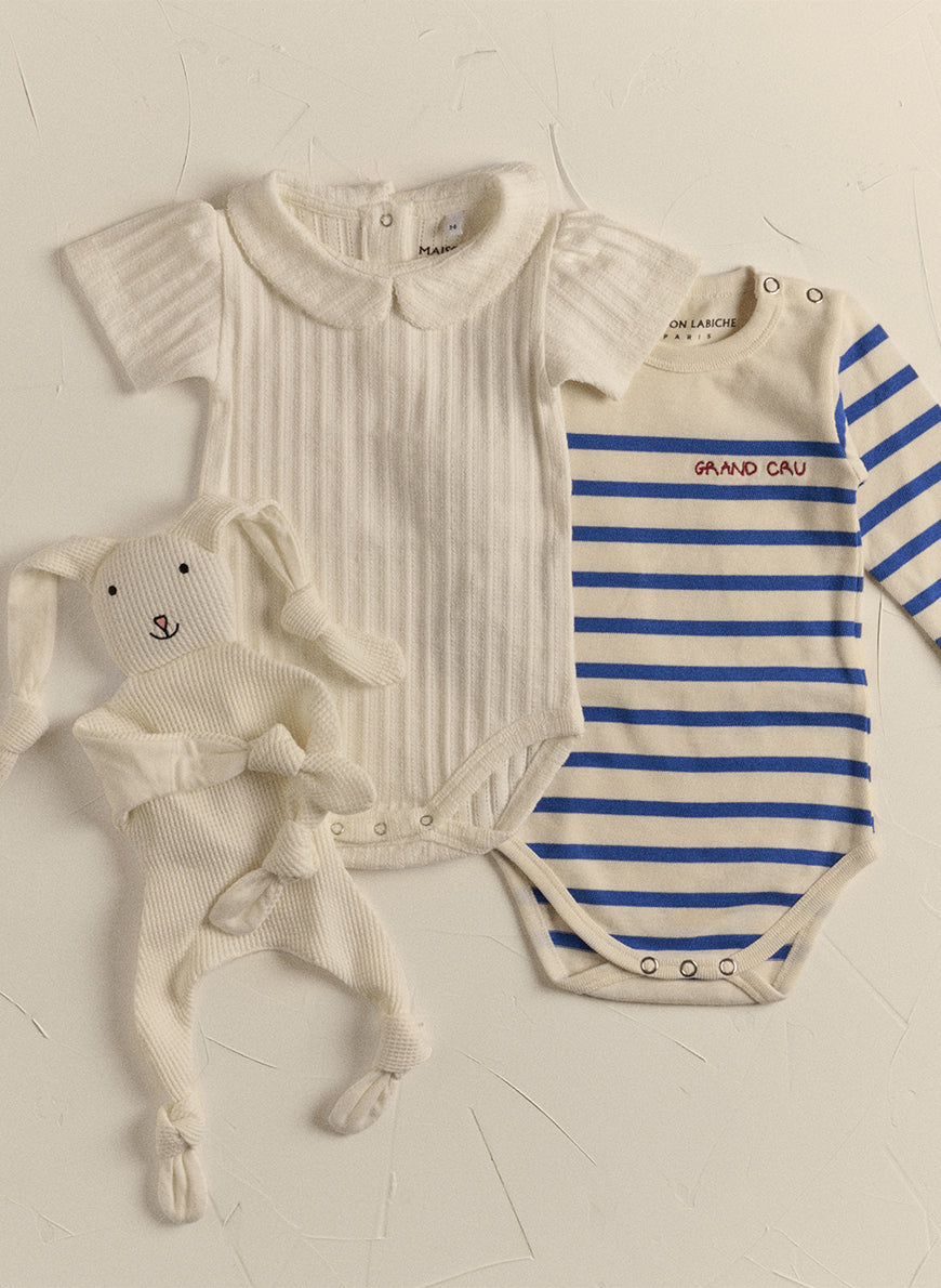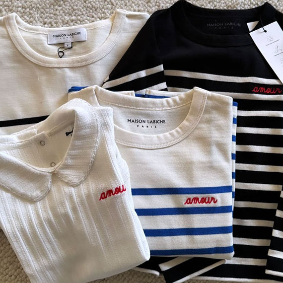Maison Labiche offers you a wide range of products to personalize: from our iconic white T-shirts to newborn bodysuits, as well as shirts and jackets, add your own words to one of our timeless pieces.
