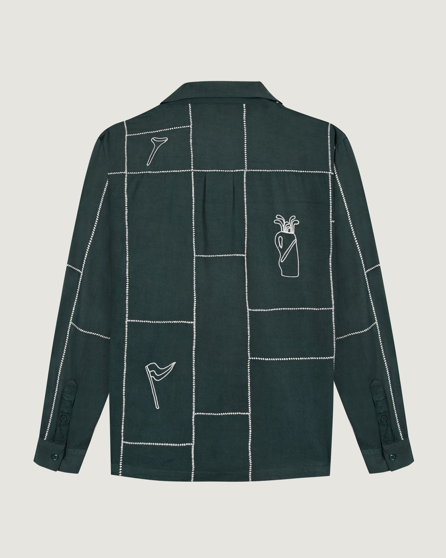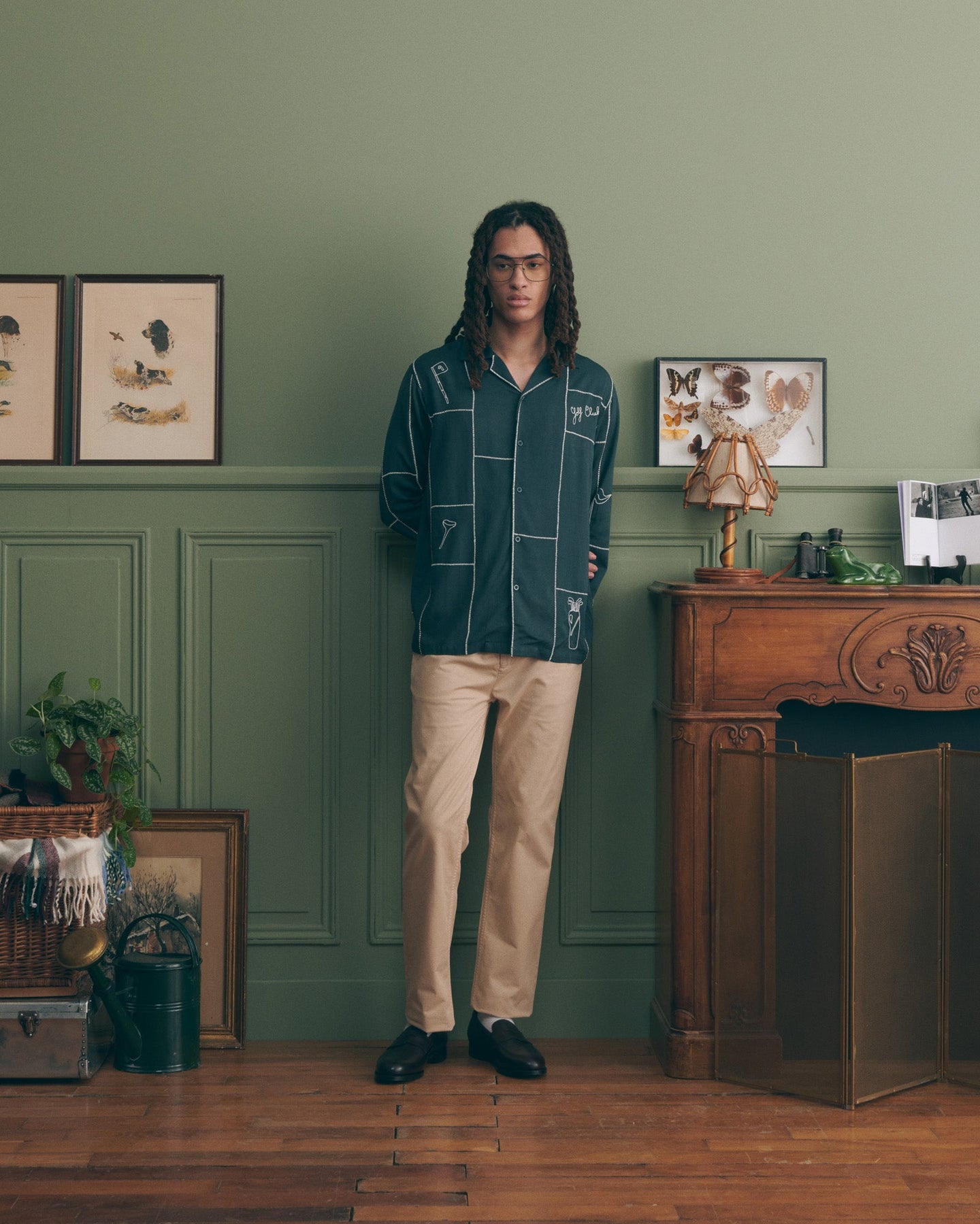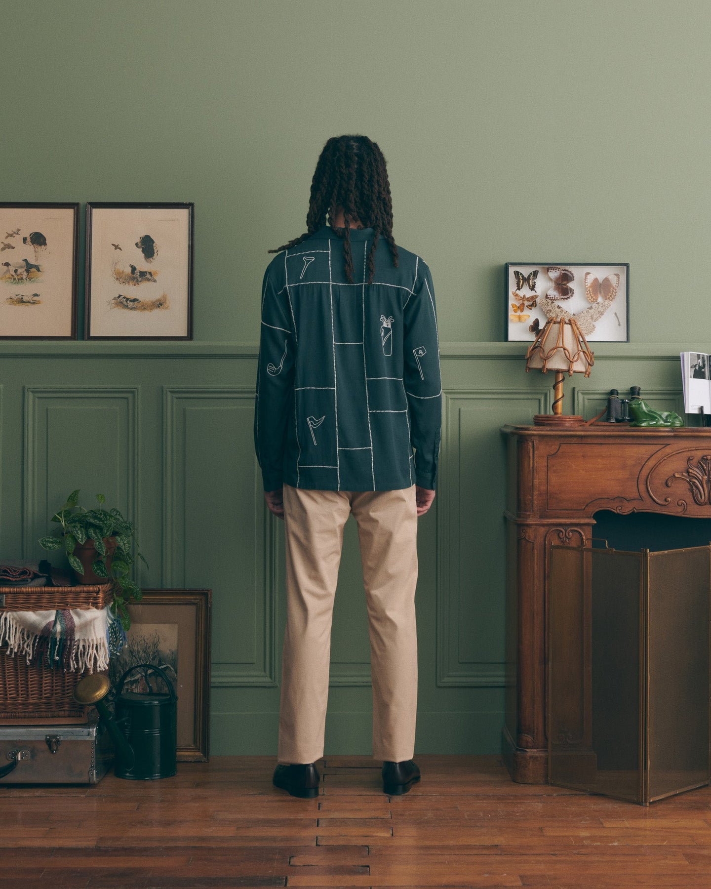 Our Riqueti shirt has a straight fit, a down collar, and Maison Labiche engraved buttons. Its embroidery is for those who swing and putt.