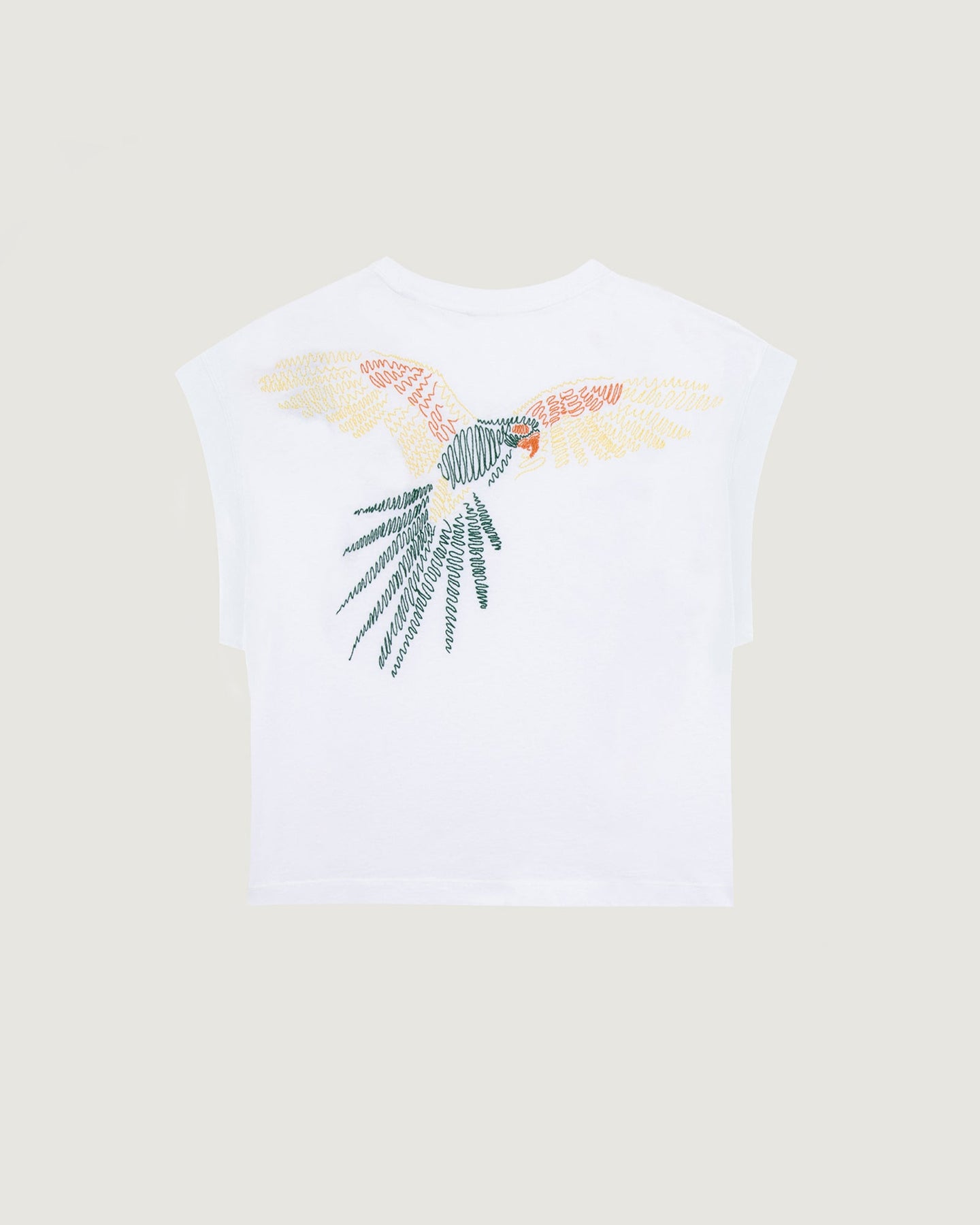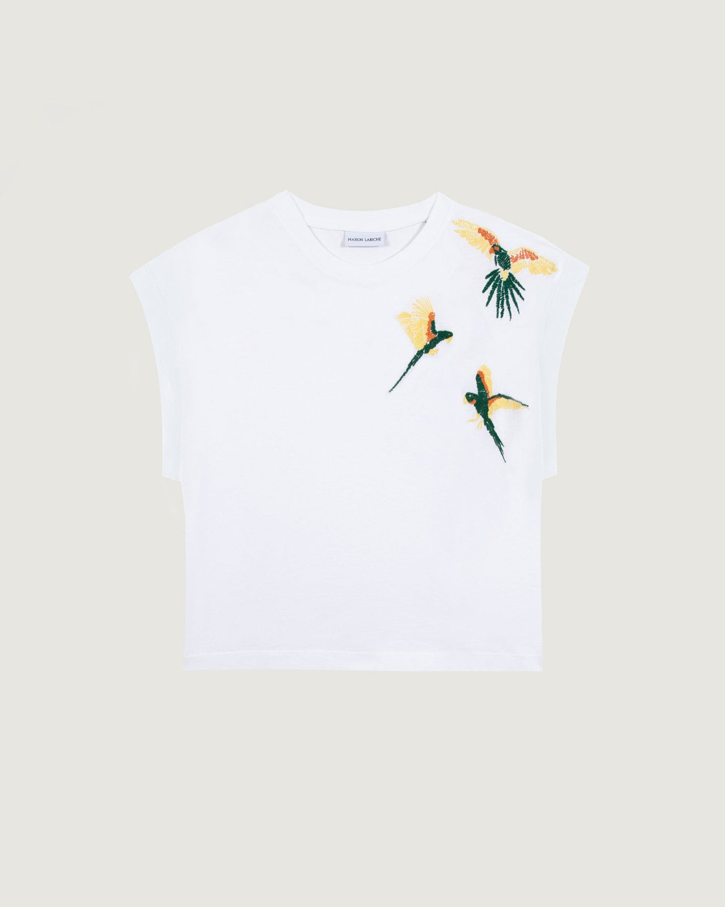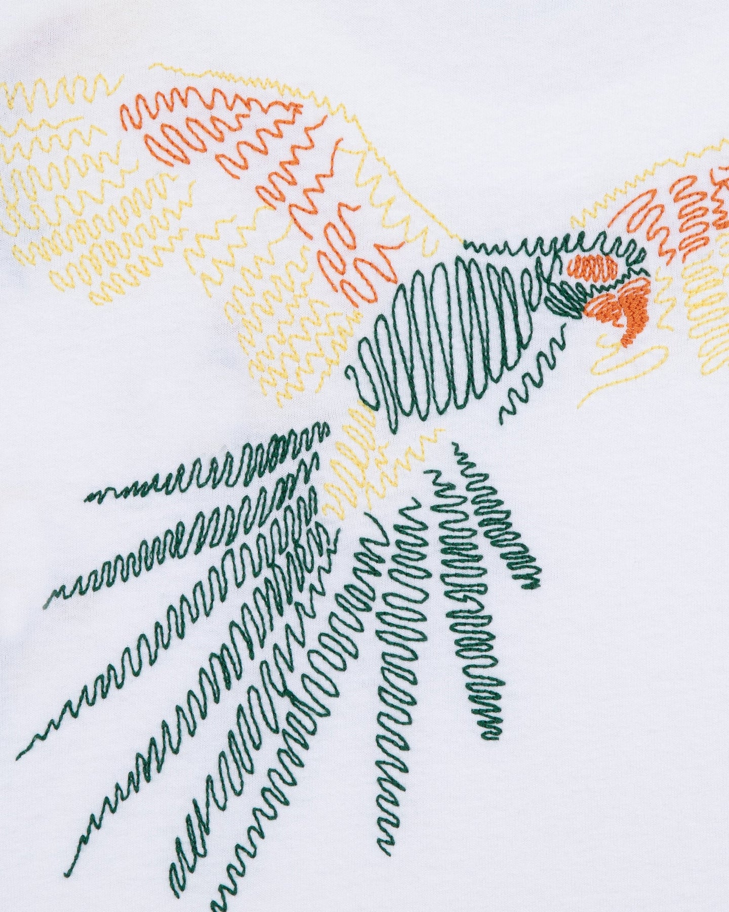 Our Pergolese t-shirt has a relaxed fit, a ribbed collar, and a double-needle hem. The sleeve cuffs are attached and topstitched. Its embroidery illustrates a flight of fancy.