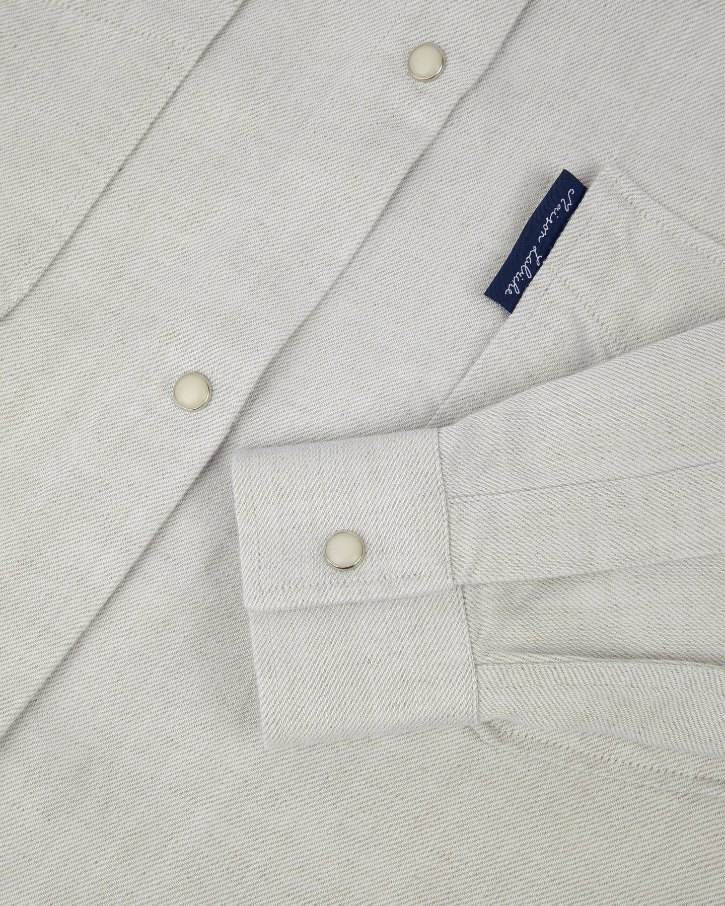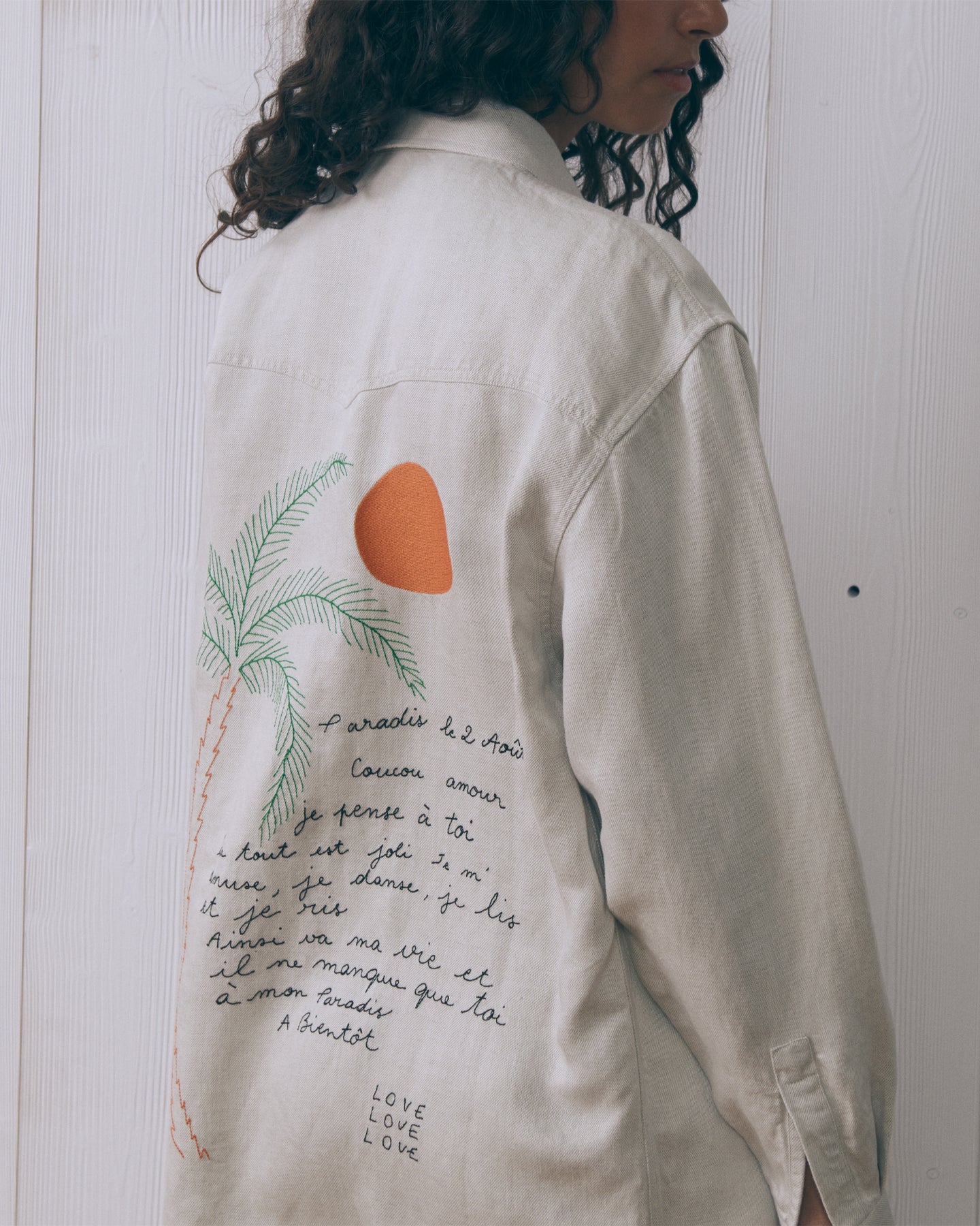 Our Monselet oversized shirt has a wide cut, a shirttail hem, patch pockets on the chest and mother-of-pearl snap buttons. her embroidery represents a gentle correspondence.